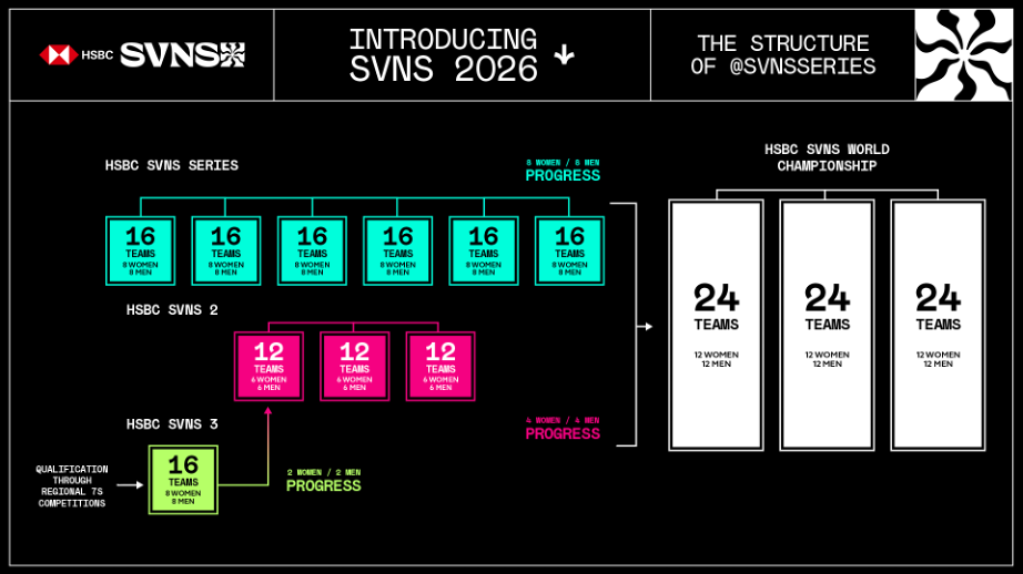 Diseñada para acercar a los aficionados a la acción como nunca antes, la renovada estructura de tres niveles promete más enfrentamientos de alto nivel, el surgimiento de más estrellas y más rugby sevens de nivel mundial en todo el mundo, con la oportunidad de que los equipos progresen de la competición regional al máximo nivel, HSBC SVNS 1, en un año.